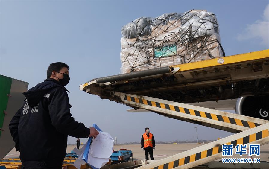 1月28日,滿載醫(yī)療防疫物資的貨運飛機在武漢天河機場卸貨。新華社記者 程敏 攝