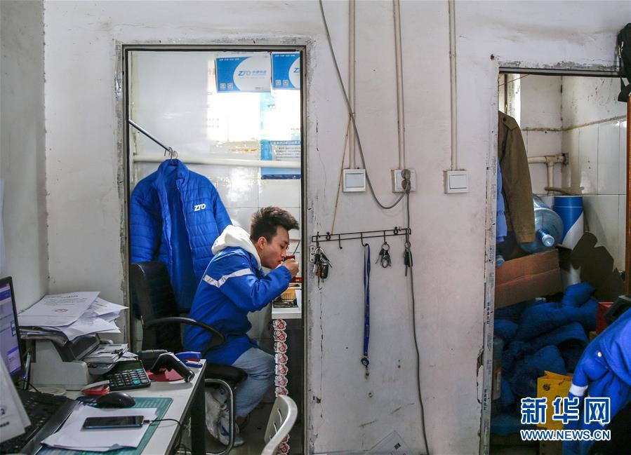 3月12日,李杰利用午休間隙在廠洼路網(wǎng)點(diǎn)吃午飯。新華社記者張玉薇攝