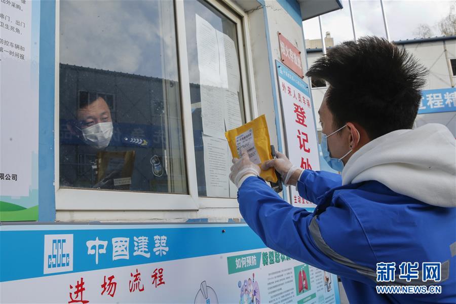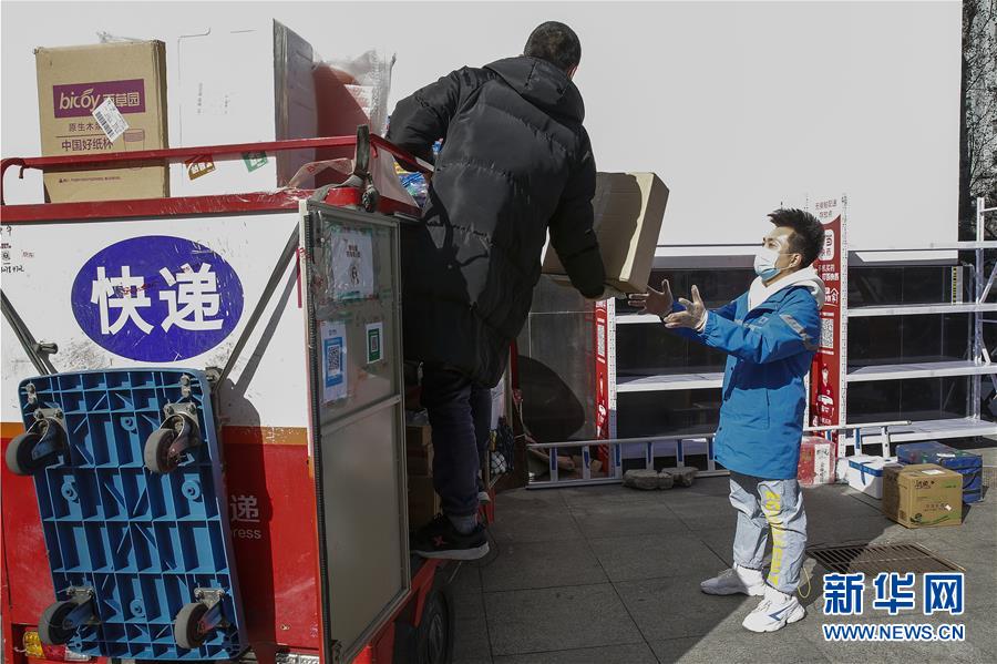 3月12日,李杰(左)在中國(guó)青年政治學(xué)院快遞點(diǎn)隔著柵欄給客戶遞送包裹。新華社記者張玉薇攝