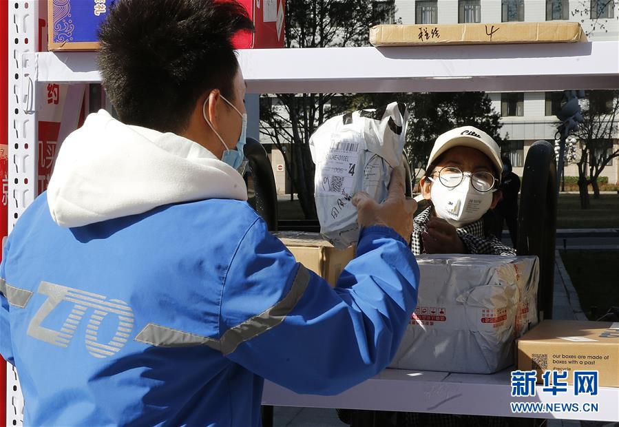 3月12日,李杰(左)在中國青年政治學(xué)院快遞點隔著柵欄給客戶遞送包裹。新華社記者張玉薇攝