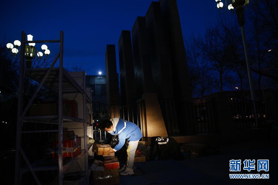 3月12日,李杰在中國青年政治學院快遞點查看仍未領(lǐng)取的包裹。新華社記者張玉薇攝