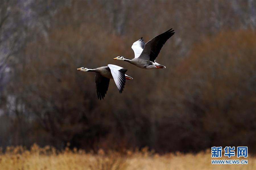 3月14日,斑頭雁在拉魯濕地上空飛翔。新華社記者張汝鋒攝