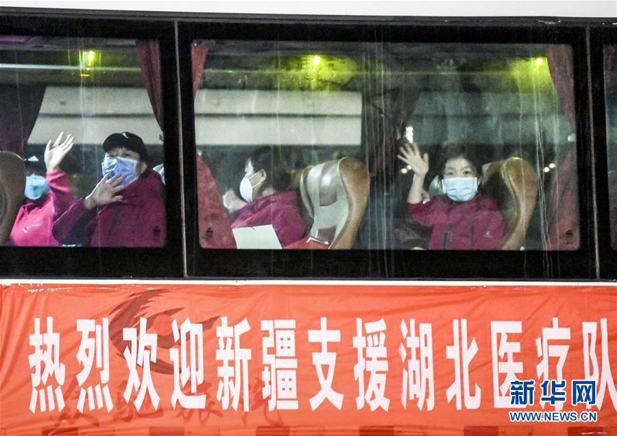 3月17日,在新疆烏魯木齊地窩堡國際機場,醫(yī)療隊隊員坐上大巴車準備離開。新華社記者王菲攝