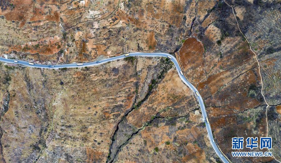 搬家的貨車行駛在云南省永善縣大興鎮(zhèn)駱丘村通往山外崎嶇的山路上(3月14日攝,無(wú)人機(jī)照片)。 新華社記者 江文耀 攝