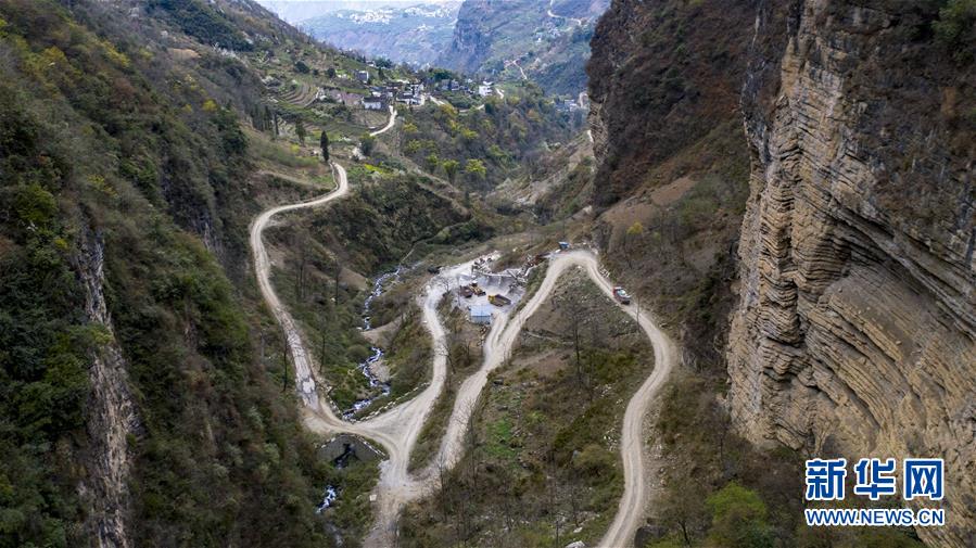 搬家的貨車(chē)行駛在云南省永善縣大興鎮(zhèn)駱丘村通往山外崎嶇的山路上(3月14日攝,無(wú)人機(jī)照片)。 新華社記者 江文耀 攝