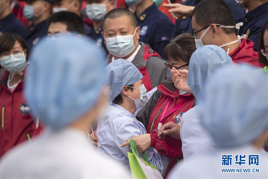 3月21日,武漢市第一醫(yī)院的醫(yī)護(hù)人員(前)送別天津市醫(yī)療隊隊員。新華社記者費(fèi)茂華攝