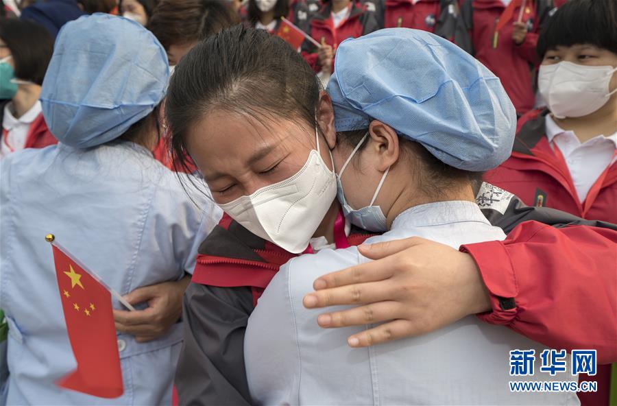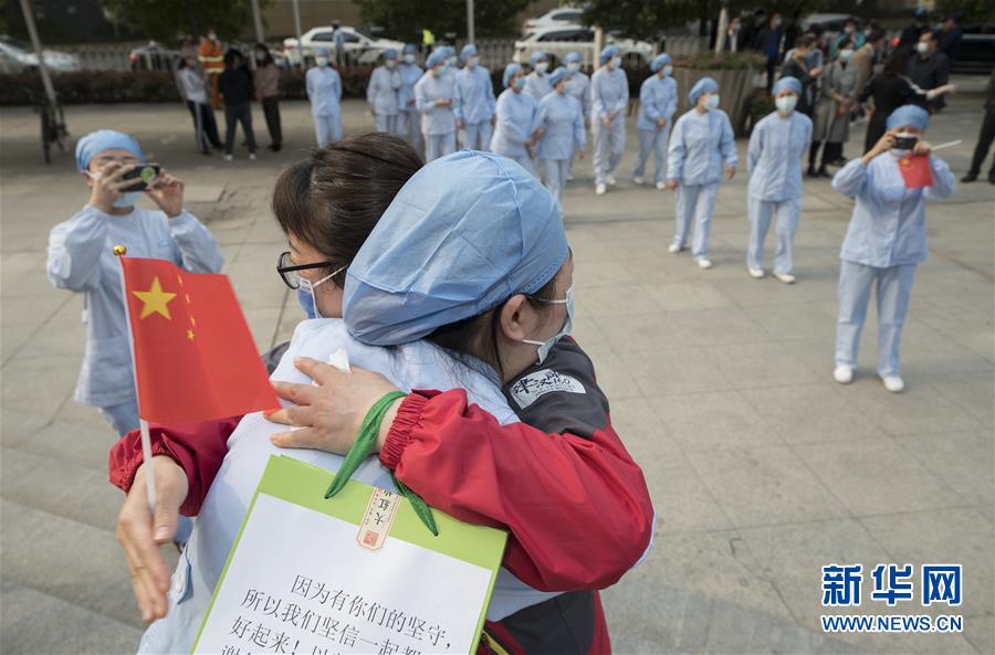 3月21日,武漢市第一醫(yī)院的醫(yī)護(hù)人員(前)與天津市醫(yī)療隊隊員李梅擁抱道別。新華社記者費(fèi)茂華攝