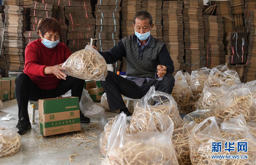 湖北當陽市壩陵辦事處群華村村民宋發(fā)林(右)和妻子在農(nóng)產(chǎn)品合作社包裝產(chǎn)品,準備通過電商外銷(3月21日攝)。近日,湖北當陽市農(nóng)業(yè)生產(chǎn)和農(nóng)產(chǎn)品加工加速恢復。截至3月19日,當陽市86家規(guī)上農(nóng)產(chǎn)品加工企業(yè)復工復產(chǎn)率為84.9%,51家農(nóng)業(yè)產(chǎn)業(yè)化重點龍頭企業(yè)有48家復工復產(chǎn),占比達94.1%。新華社記者程敏攝
