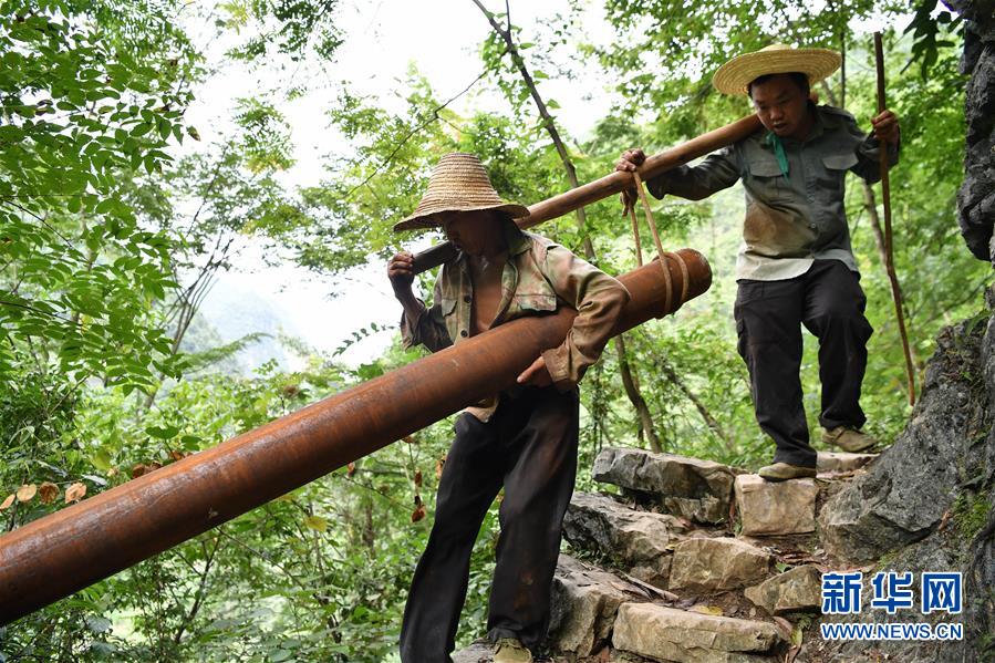 在廣西大化瑤族自治縣板升鄉(xiāng)弄雷村,工人們抬著抗旱飲水工程的水管在山路上前行(2016年8月10日攝)。廣西有近一半貧困人口生活在石漠化地區(qū),涉及數(shù)十個縣區(qū)。這里也是廣西飲水保障程度最低的地區(qū),解決貧困人口飲水問題是廣西脫貧攻堅戰(zhàn)“硬仗中的硬仗”?!笆濉币詠?,廣西加快實施農(nóng)村飲水安全鞏固提升工程。因地制宜,采取新建、擴(kuò)建及管網(wǎng)延伸等多種措施,補齊貧困地區(qū)水利薄弱短板,進(jìn)一步提升石漠化地區(qū)群眾飲水安全保障水平,助推脫貧攻堅。新華社記者黃孝邦攝