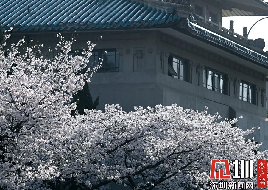 近日,隨著氣溫上升,武漢大學(xué)圖書館附近一片櫻花開放。新華社記者費(fèi)茂華攝