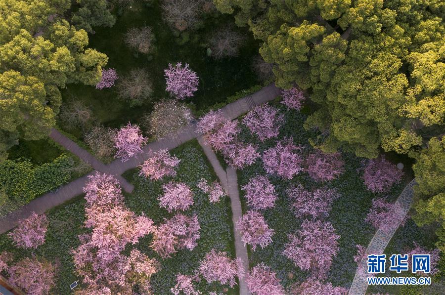 這是3月14日拍攝的武漢東湖磨山櫻園景色(無(wú)人機(jī)照片)。近日氣溫漸升,武漢東湖磨山櫻園里的櫻花漸次盛開,帶來(lái)春天的氣息。新華社記者熊琦攝