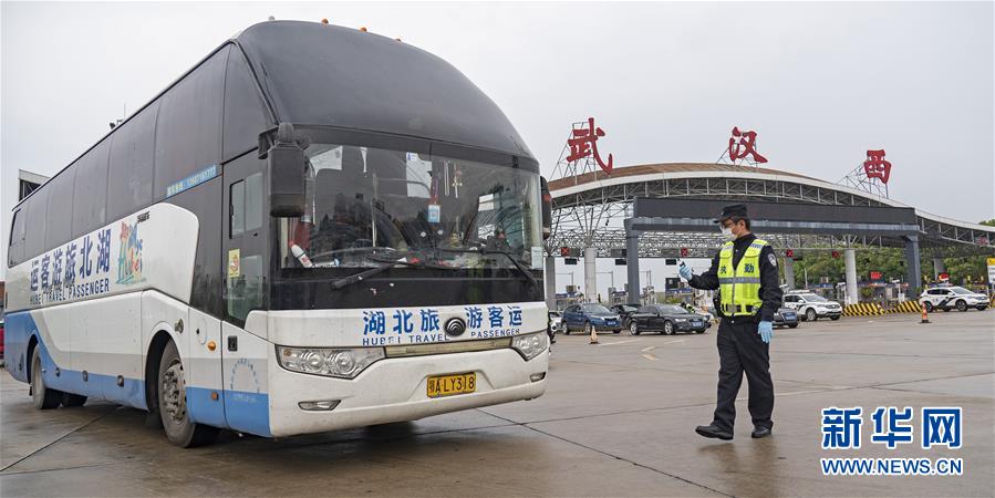 3月24日,在武漢西高速收費站交通卡點,執(zhí)勤民警陳鋼示意載有復工復產(chǎn)人員的大巴通行。新華社記者才揚攝