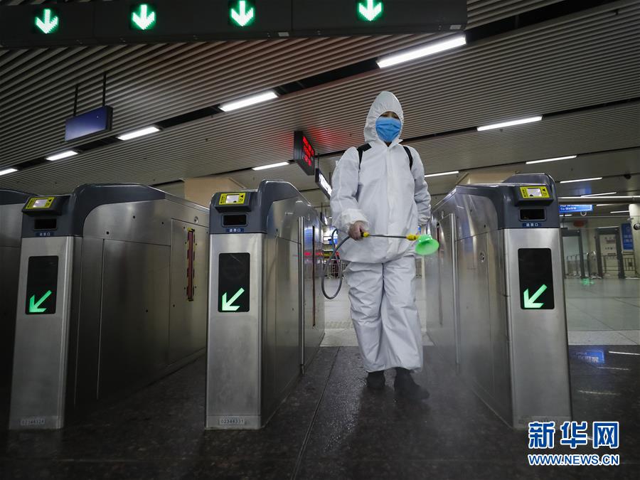 3月23日,在武漢地鐵常青車輛段,保潔人員在消毒。新華社記者肖藝九攝