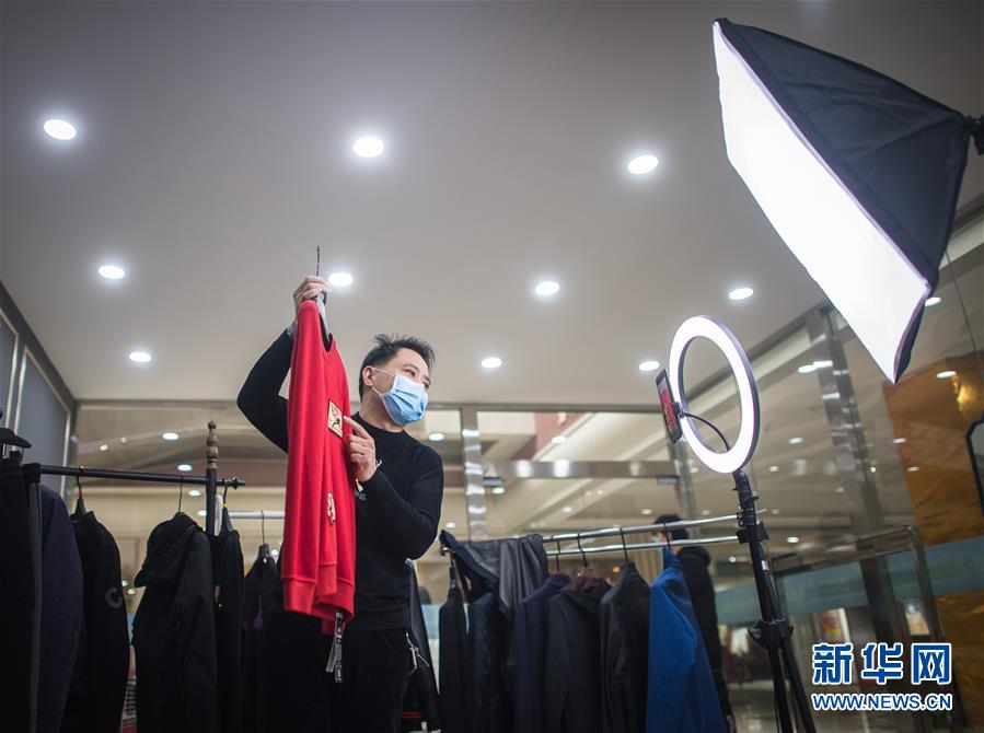 3月29日,在漢口北市場,一名主播在直播平臺直播銷售一款服裝。隨著疫情防控形勢好轉(zhuǎn),武漢漢口北國際商品交易中心30多個市場全面開市運行。為助力商戶做好線上線下全面開市,市場積極引入50多家互聯(lián)網(wǎng)平臺、電商平臺及直播機構(gòu),服務(wù)市場商戶。新華社記者肖藝九攝
