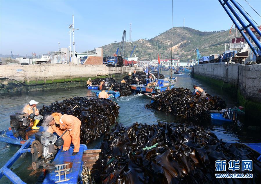 4月10日,霞浦縣長春鎮(zhèn)海帶養(yǎng)殖戶在埕塢碼頭吊運海帶。新華社記者姜克紅攝