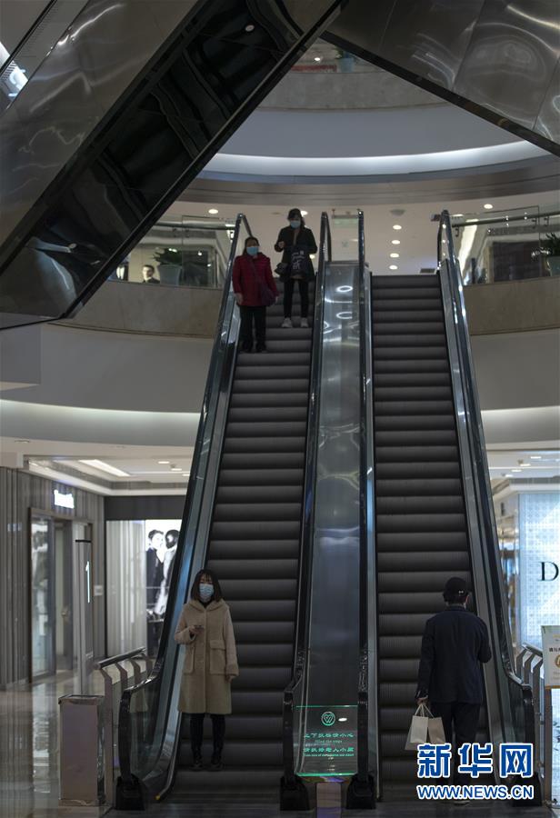 3月30日,在武商世貿(mào)廣場(chǎng),一位顧客乘坐滾梯。當(dāng)日,武漢市多家商場(chǎng)開門迎客。新華社記者費(fèi)茂華攝