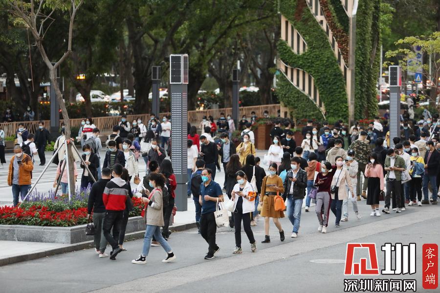 見圳客戶端·深圳新聞網(wǎng)2020年3月19日訊 下班時(shí)間,深圳地鐵一號線深大站A3出口外,下班后的市民在站外排大排長龍,依次有序進(jìn)入地鐵站乘坐列車回家。