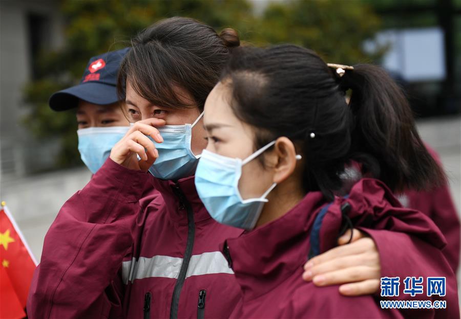 4月3日,來自西安交通大學(xué)第一附屬醫(yī)院的醫(yī)療隊(duì)隊(duì)員王沙沙(前)在送別“戰(zhàn)友”后落淚。 當(dāng)日,陜西省第一批援鄂醫(yī)療隊(duì)137名隊(duì)員在陜西省工人療養(yǎng)院結(jié)束了為期兩周的隔離休養(yǎng)。醫(yī)療隊(duì)員與“戰(zhàn)友”深情作別后,陸續(xù)踏上歸途。 新華社記者 李一博 攝