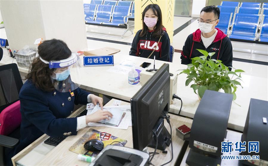 4月7日,在武漢市江岸區(qū)民政局婚姻登記處,工作人員為新人陳先生與張女士辦理結(jié)婚登記手續(xù)。  新華社記者才揚(yáng)攝