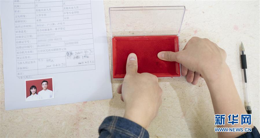 4月7日,在武漢市江岸區(qū)民政局婚姻登記處,新人辦理結(jié)婚手續(xù)時(shí)按手印。  新華社記者才揚(yáng)攝