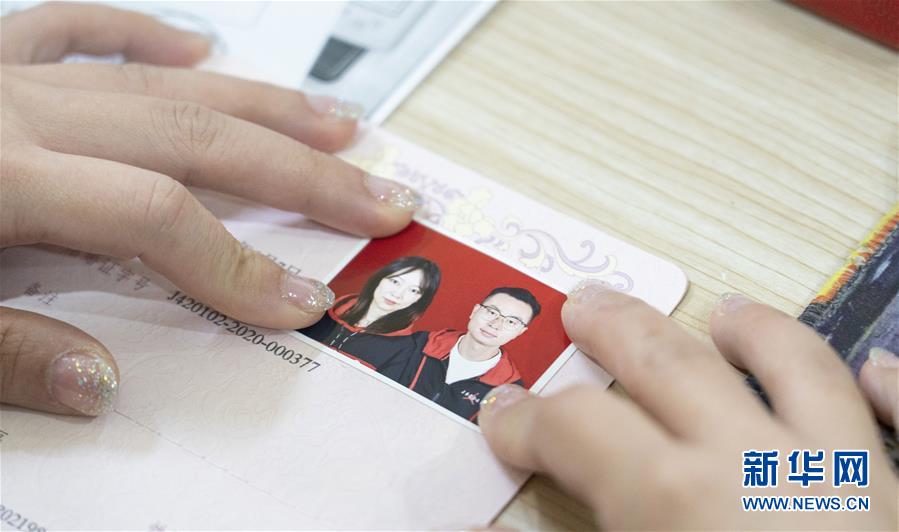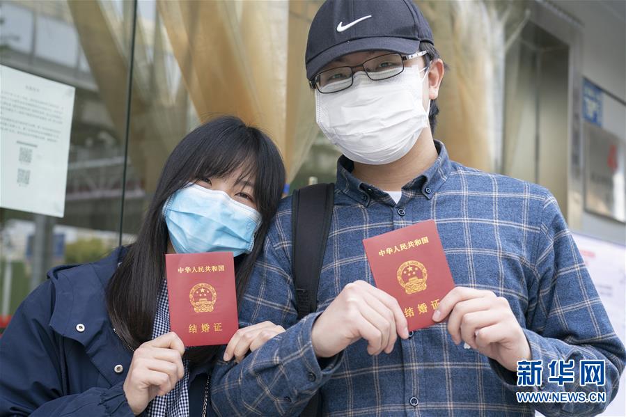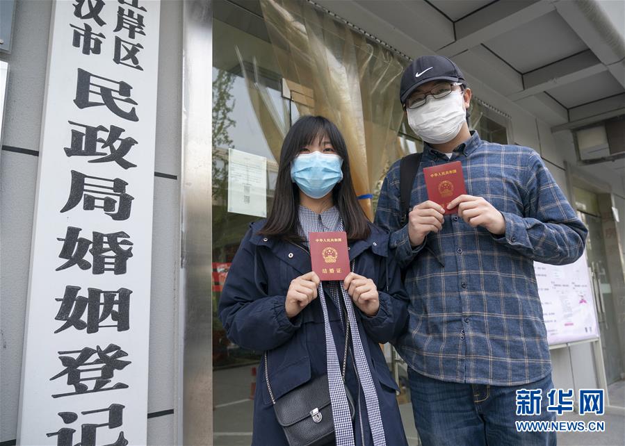 4月7日,在武漢市江岸區(qū)民政局婚姻登記處,新人盧先生和丁女士展示結(jié)婚證。  新華社記者才揚(yáng)攝