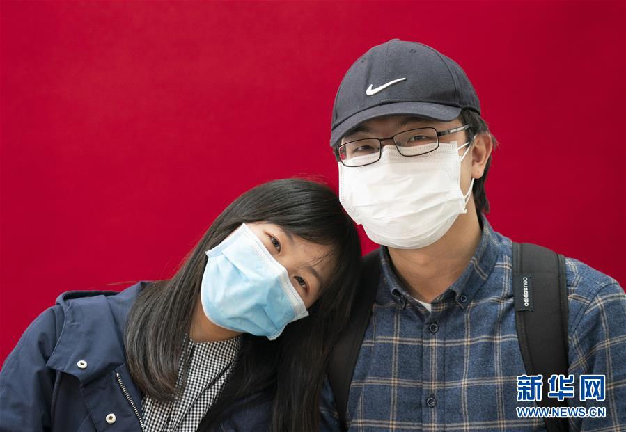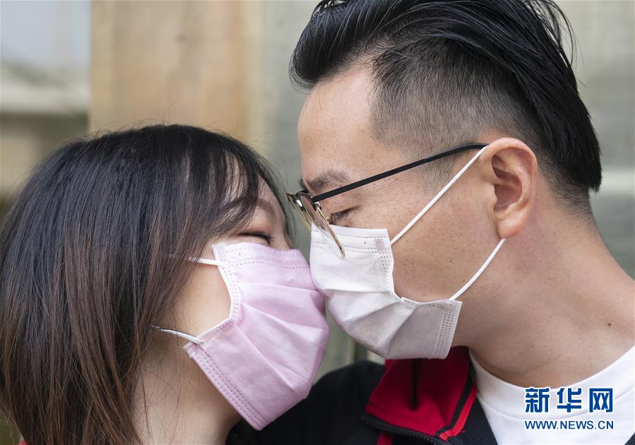 4月7日,在武漢市江岸區(qū)民政局婚姻登記處,陳先生與張女士隔著口罩親吻。  新華社記者才揚(yáng)攝