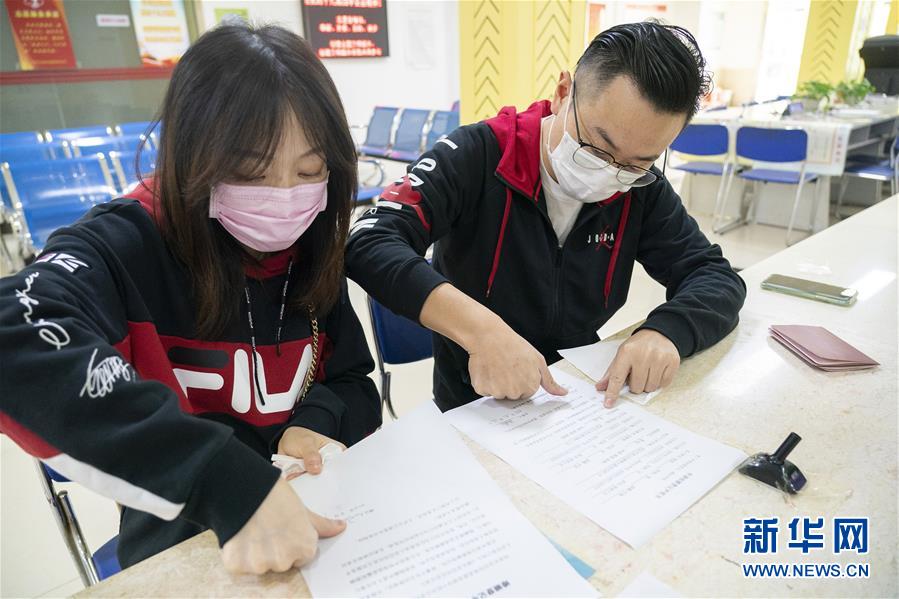 4月7日,在武漢市江岸區(qū)民政局婚姻登記處,新人陳先生與張女士辦理結(jié)婚登記手續(xù)。  新華社記者才揚(yáng)攝