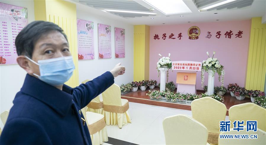 4月7日,武漢市江岸區(qū)民政局婚姻登記處工作人員介紹頒證廳,疫情期間這里暫停使用。  新華社記者才揚(yáng)攝