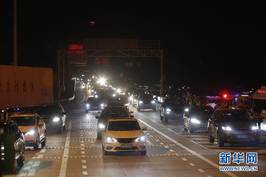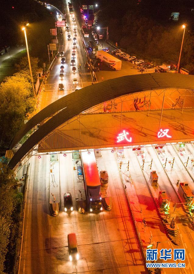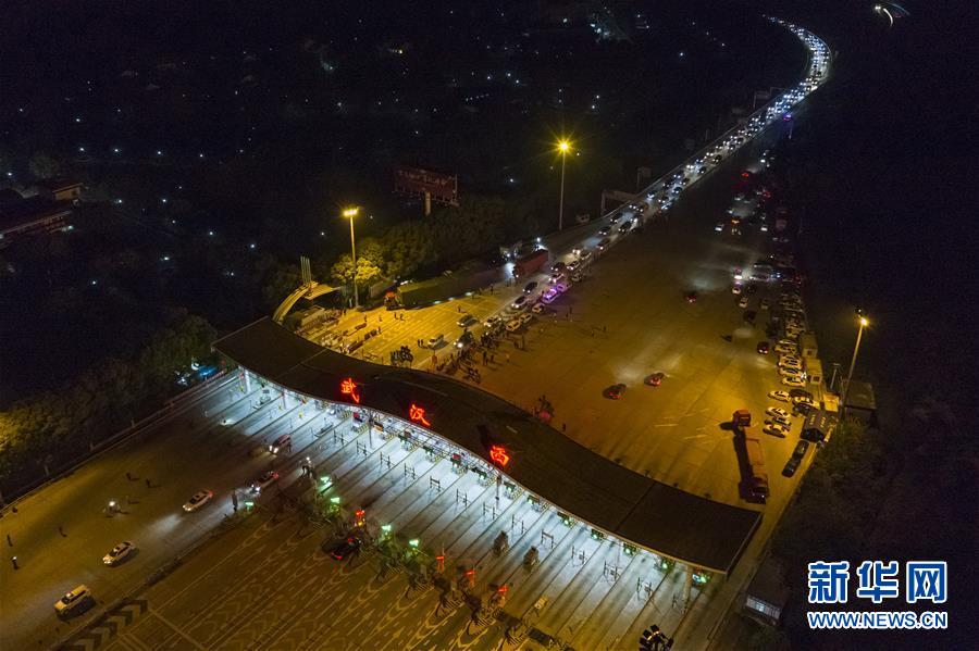 4月8日凌晨,車輛通過武漢北高速收費站(無人機(jī)照片)。 新華社記者 肖藝九 攝