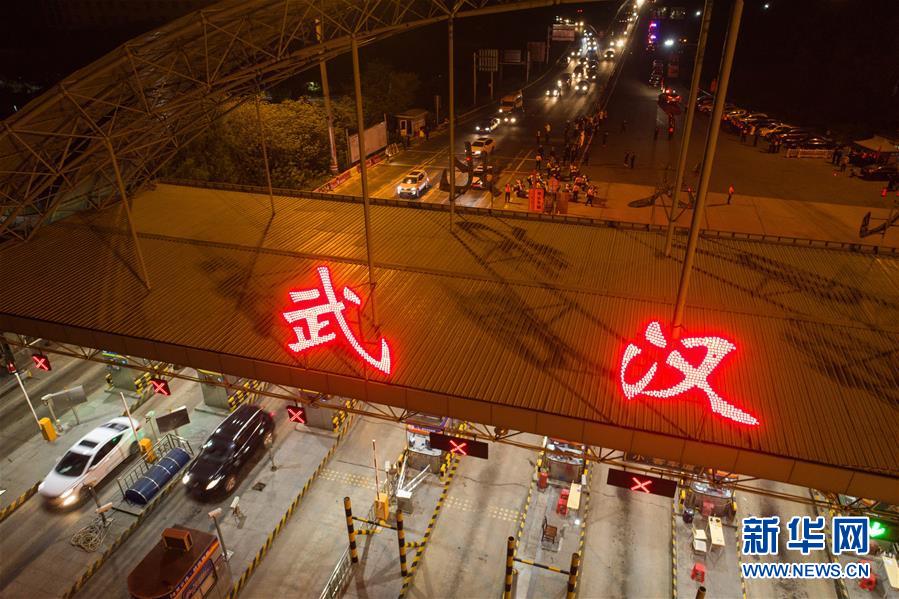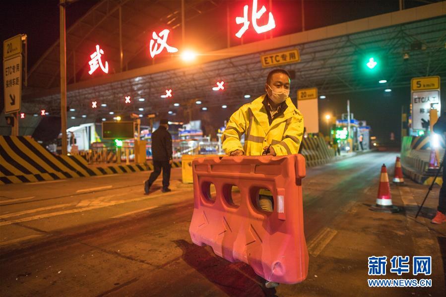 4月8日凌晨,在武漢北高速收費站,工作人員移除圍欄。 新華社記者 肖藝九 攝