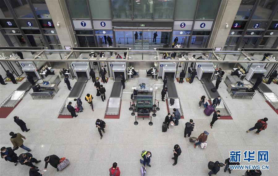 4月7日晚,旅客接受安檢后進(jìn)入武昌火車站。 新華社記者 費茂華 攝