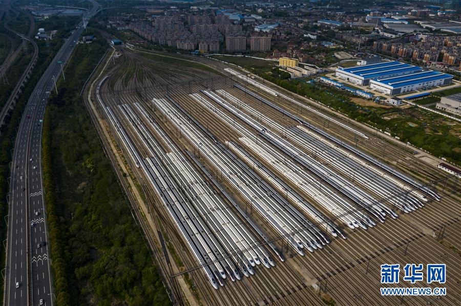 4月7日,在武漢動車段,列車停靠在存車線上(無人機照片)。 新華社記者 肖藝九 攝