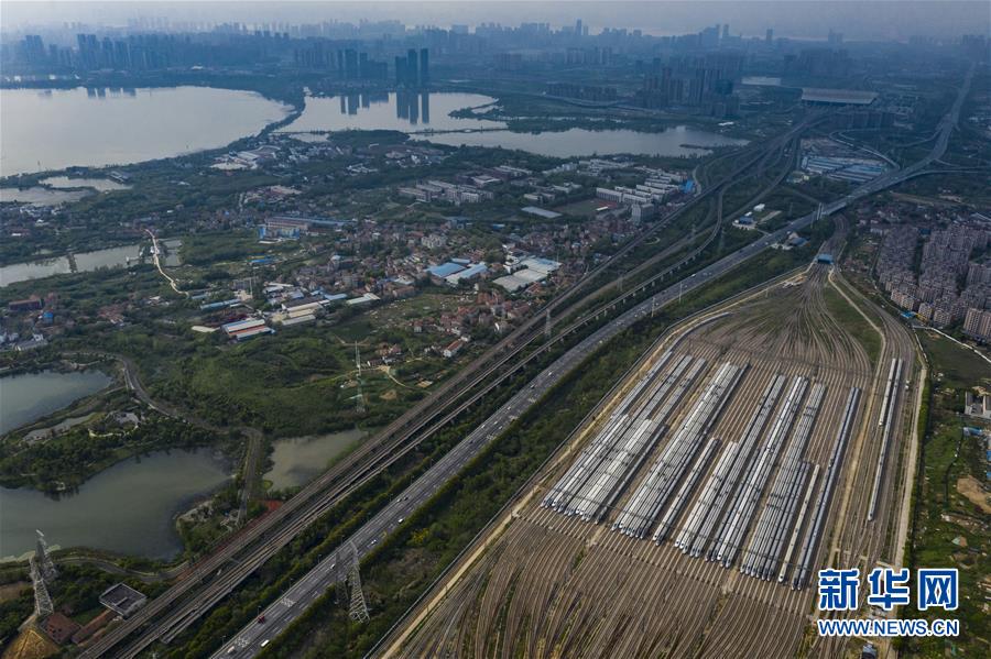 4月7日,在武漢動車段,列車??吭诖孳嚲€上(無人機照片)。 新華社記者 肖藝九 攝