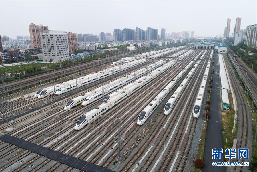 4月7日,在武漢動車段,列車??吭诖孳嚲€上(無人機(jī)照片)。 新華社記者 肖藝九 攝