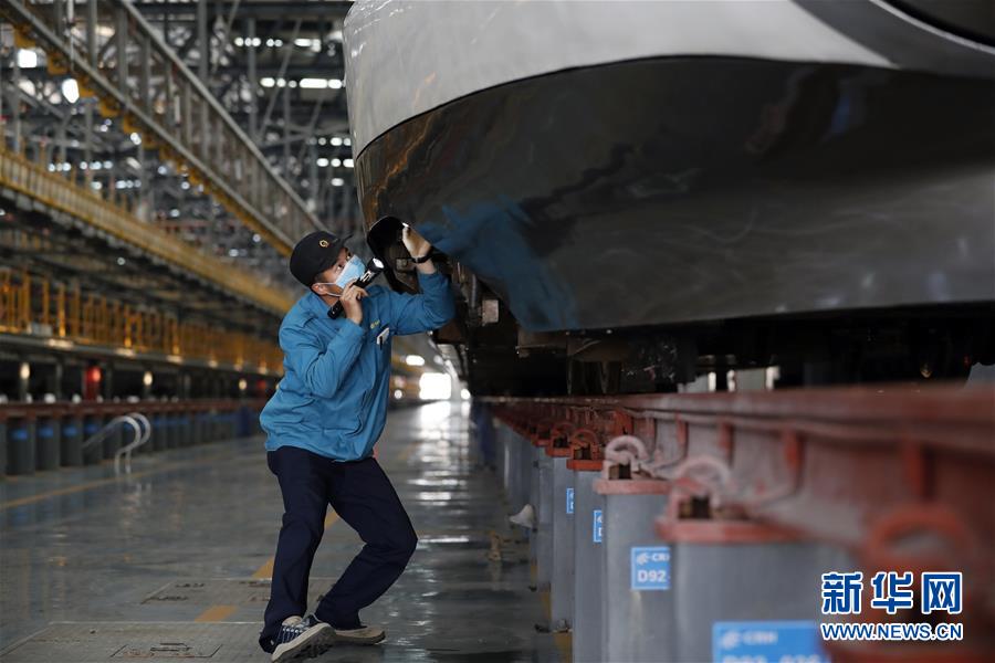 4月7日,武漢動(dòng)車段運(yùn)用車間地勤機(jī)械師程廣在檢查車底走行部。 新華社記者 沈伯韓 攝