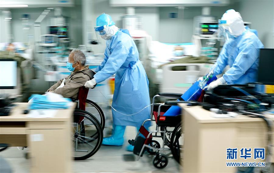 3月20日,武漢火神山醫(yī)院重癥醫(yī)學(xué)一科副主任宋立強(qiáng)(中)護(hù)送81歲的新冠肺炎重癥患者去做CT檢查。為確保患者有充足供氧,醫(yī)生胡世頡推著氧氣瓶隨行。 新華社記者 王毓國(guó) 攝