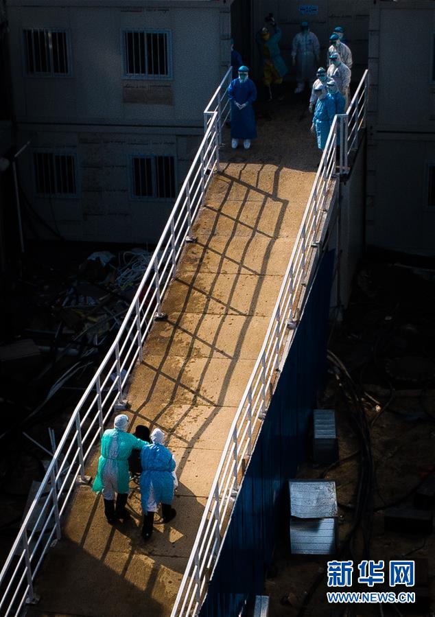 2月4日,醫(yī)護(hù)人員將患者送入武漢火神山醫(yī)院病房(無(wú)人機(jī)照片)。 新華社記者 肖藝九 攝