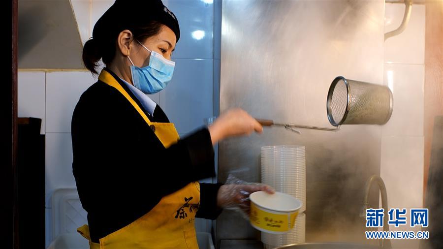 3月28日,“蔡林記”熱干面館店長(zhǎng)周秋香在做熱干面。 新華社記者 熊琦 攝
