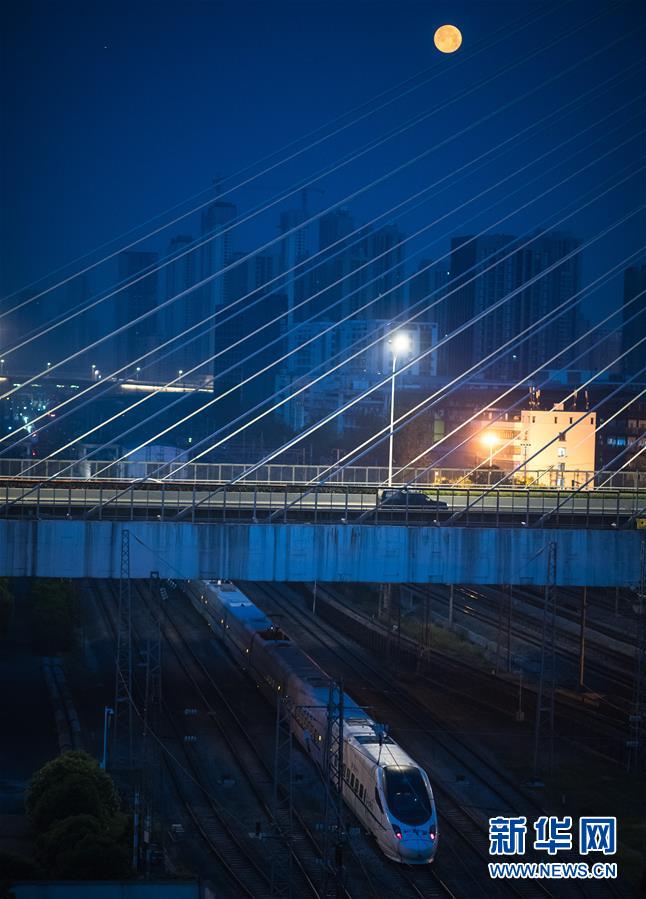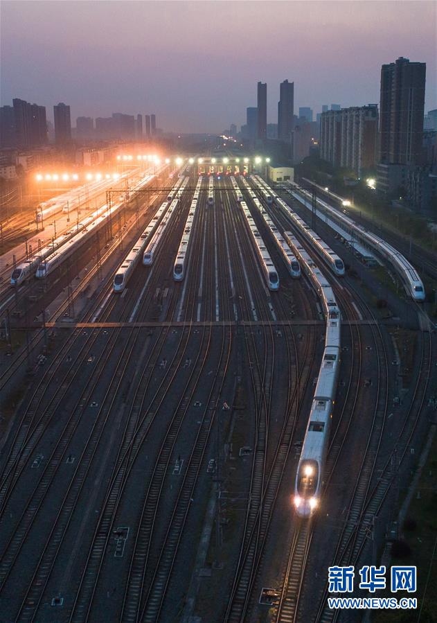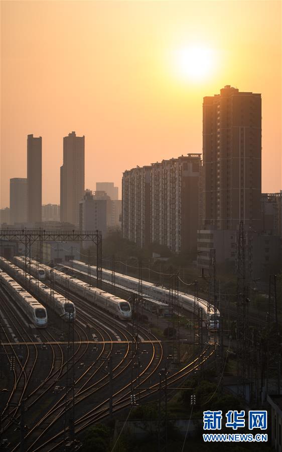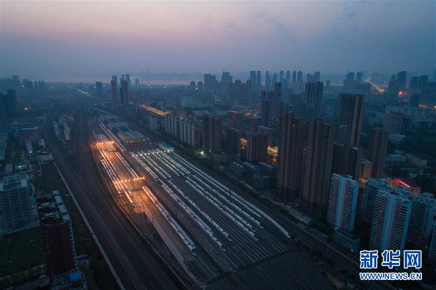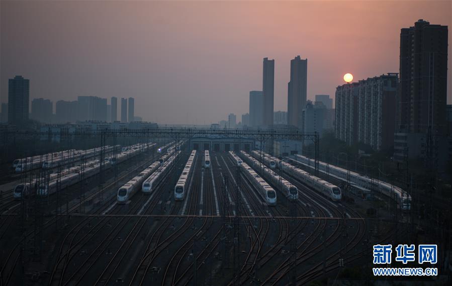 4月8日,在武漢動車段,列車停靠在存車線上準備投入運行。 新華社記者 肖藝九 攝