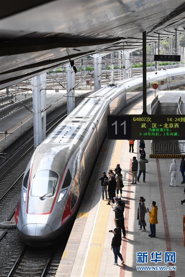 4月8日,G4802次列車駛?cè)氡本┪髡?。?dāng)日,武漢市正式解除離漢離鄂通道管控措施,首趟武漢返京列車G4802次列車抵達(dá)北京西站。新華社記者鞠煥宗攝
