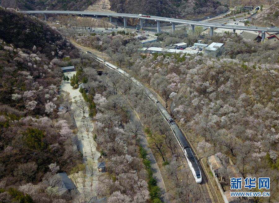 4月8日,北京青龍橋火車站附近春花盛開(無人機(jī)照片)。 新華社記者張晨霖攝
