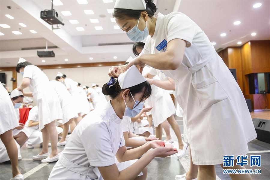 4月26日,北京大學人民醫(yī)院新入職護士參加授帽儀式。當日,北京大學人民醫(yī)院為97名2019屆新入職護士舉行隆重莊嚴的授帽儀式和重溫南丁格爾誓言的活動,以此紀念南丁格爾誕辰200周年和即將到來的“國際護士節(jié)”?;顒舆€邀請了5名援鄂國家醫(yī)療隊護士代表分享戰(zhàn)“疫”故事。新華社記者張玉薇攝