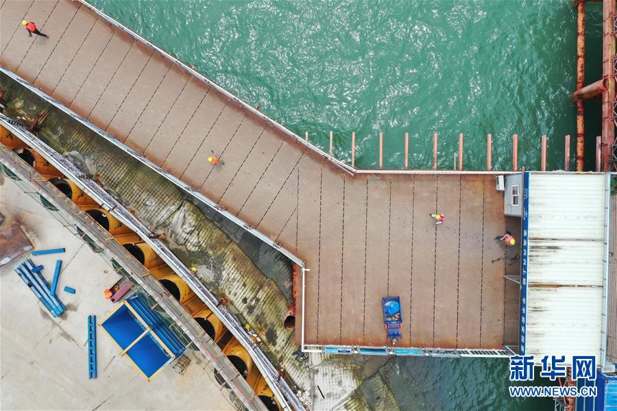 4月25日,幾名工人從海上生活區(qū)前往工地(無人機照片)。