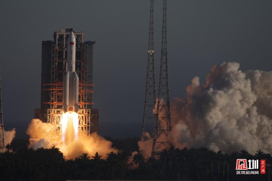 2020年5月5日18時,長征五號B運載火箭在文昌發(fā)射場點火升空,這是在第一次程序轉(zhuǎn)彎后正常飛行。