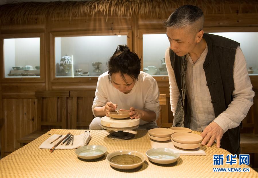 5月8日,“90后”瓷人湯佳(左)在龍泉青瓷裝飾紋樣研究所對(duì)著項(xiàng)宏金收藏的古瓷器刻劃魚紋盤。1965年出生的項(xiàng)宏金,被浙江龍泉年輕一代瓷人稱為“項(xiàng)哥”,他從20世紀(jì)90年代開始收集龍泉青瓷標(biāo)本,研究青瓷紋樣。2014年出版著作《龍泉青瓷裝飾紋樣》,次年開設(shè)龍泉青瓷裝飾紋樣研究所,將自己收藏的千余件標(biāo)本跟瓷器愛好者、創(chuàng)作者免費(fèi)分享。新華社記者翁忻旸攝