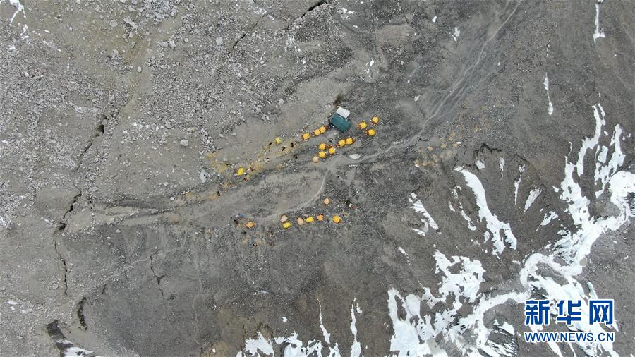 這是海拔5800米的珠峰過渡營地(5月8日攝,無人機照片)。珠峰過渡營地海拔5800米,是連接前進營地和珠峰大本營的重要一站。登山愛好者從大本營徒步大約四個小時就能抵達過渡營地。此段路程亂石林立,同時也能欣賞壯美的冰川。新華社記者孫非攝