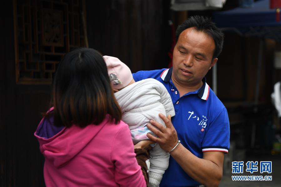 施六金(右)從妻子手中接過兒子施澤恩(4月25日攝)。1973年出生于十八洞村的施六金,由于父親患病很早就放棄學(xué)業(yè)和母親扛起了家庭的重?fù)?dān)。為了生活,他還曾遠(yuǎn)去東南亞打工。2015年,看到家鄉(xiāng)的變化,施六金回到村里開起了農(nóng)家樂,年度家庭人均純收入也從2014年的1715元增長到了2019年的35696元。2018年,施六金與心愛的人組建了家庭。今年初,施六金與愛人迎來了一個(gè)大胖小子?!白鋈俗鍪乱没貓?bào)和感恩。”施六金給剛出生的兒子取名施澤恩。新華社記者薛宇舸攝