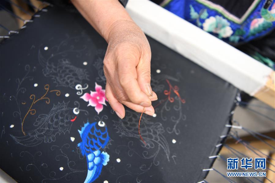 吳美金在十八洞村苗繡特產(chǎn)農(nóng)民專業(yè)合作社繡苗繡(4月24日攝)。1967年出生的吳美金,1992年嫁入飛蟲村(現(xiàn)十八洞村飛蟲寨)時(shí),只有爛泥路的飛蟲村不僅田土少,掙錢活路也少,生活十分困難。2014年,吳美金加入了十八洞村苗繡特產(chǎn)農(nóng)民專業(yè)合作社,從小就會(huì)的苗繡傳統(tǒng)手藝如今成了家庭增收的法寶,不僅在家門口就把錢掙了,同時(shí)還能照顧年幼的孫子孫女?!艾F(xiàn)在的日子,比年輕的時(shí)候好多了?!眳敲澜鹫f。新華社記者薛宇舸攝