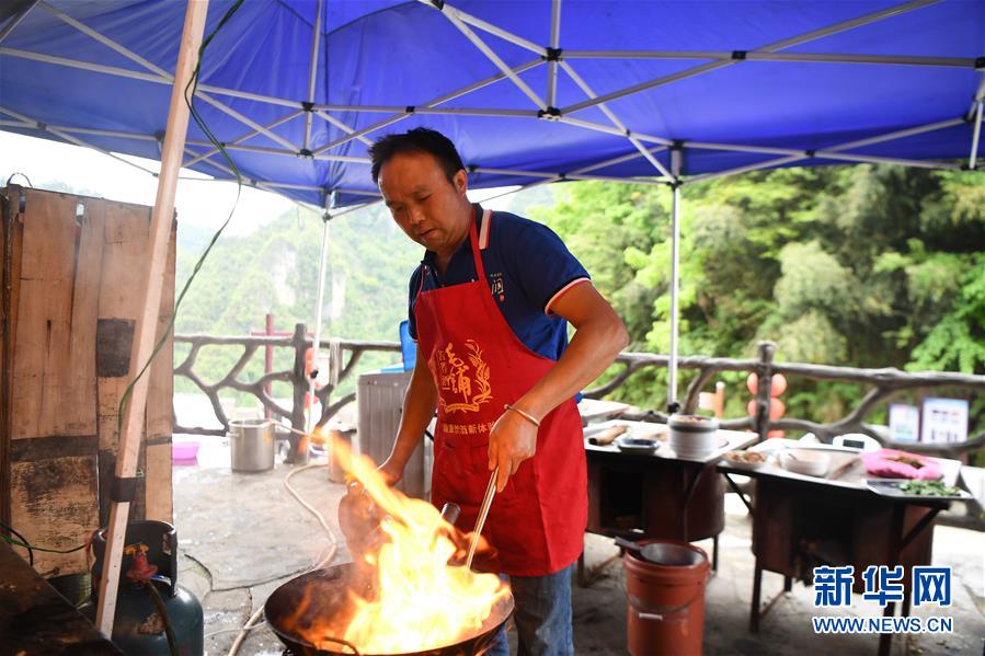 施六金在自家開的農(nóng)家樂為客人準(zhǔn)備午餐(4月25日攝)。1973年出生于十八洞村的施六金,由于父親患病很早就放棄學(xué)業(yè)和母親扛起了家庭的重?fù)?dān)。為了生活,他還曾遠(yuǎn)去東南亞打工。2015年,看到家鄉(xiāng)的變化,施六金回到村里開起了農(nóng)家樂,年度家庭人均純收入也從2014年的1715元增長到了2019年的35696元。2018年,施六金與心愛的人組建了家庭。今年初,施六金與愛人迎來了一個(gè)大胖小子?!白鋈俗鍪乱没貓?bào)和感恩?!笔┝鸾o剛出生的兒子取名施澤恩。新華社記者薛宇舸攝
