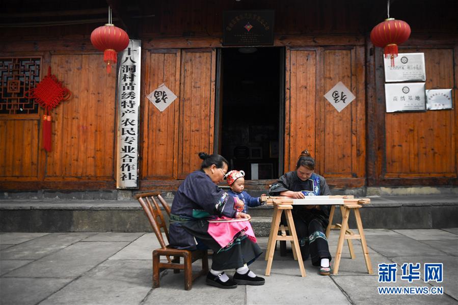 吳美金(右)在十八洞村苗繡特產(chǎn)農(nóng)民專業(yè)合作社繡苗繡(4月24日攝)。1967年出生的吳美金,1992年嫁入飛蟲村(現(xiàn)十八洞村飛蟲寨)時(shí),只有爛泥路的飛蟲村不僅田土少,掙錢活路也少,生活十分困難。2014年,吳美金加入了十八洞村苗繡特產(chǎn)農(nóng)民專業(yè)合作社,從小就會(huì)的苗繡傳統(tǒng)手藝如今成了家庭增收的法寶,不僅在家門口就把錢掙了,同時(shí)還能照顧年幼的孫子孫女?!艾F(xiàn)在的日子,比年輕的時(shí)候好多了?!眳敲澜鹫f。新華社記者薛宇舸攝